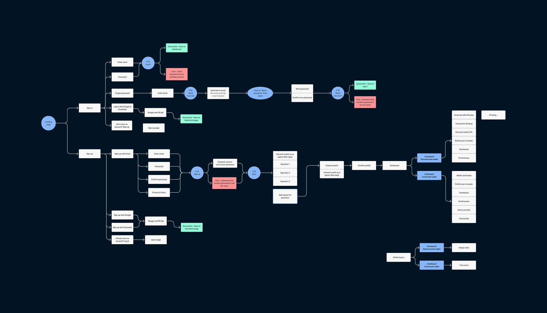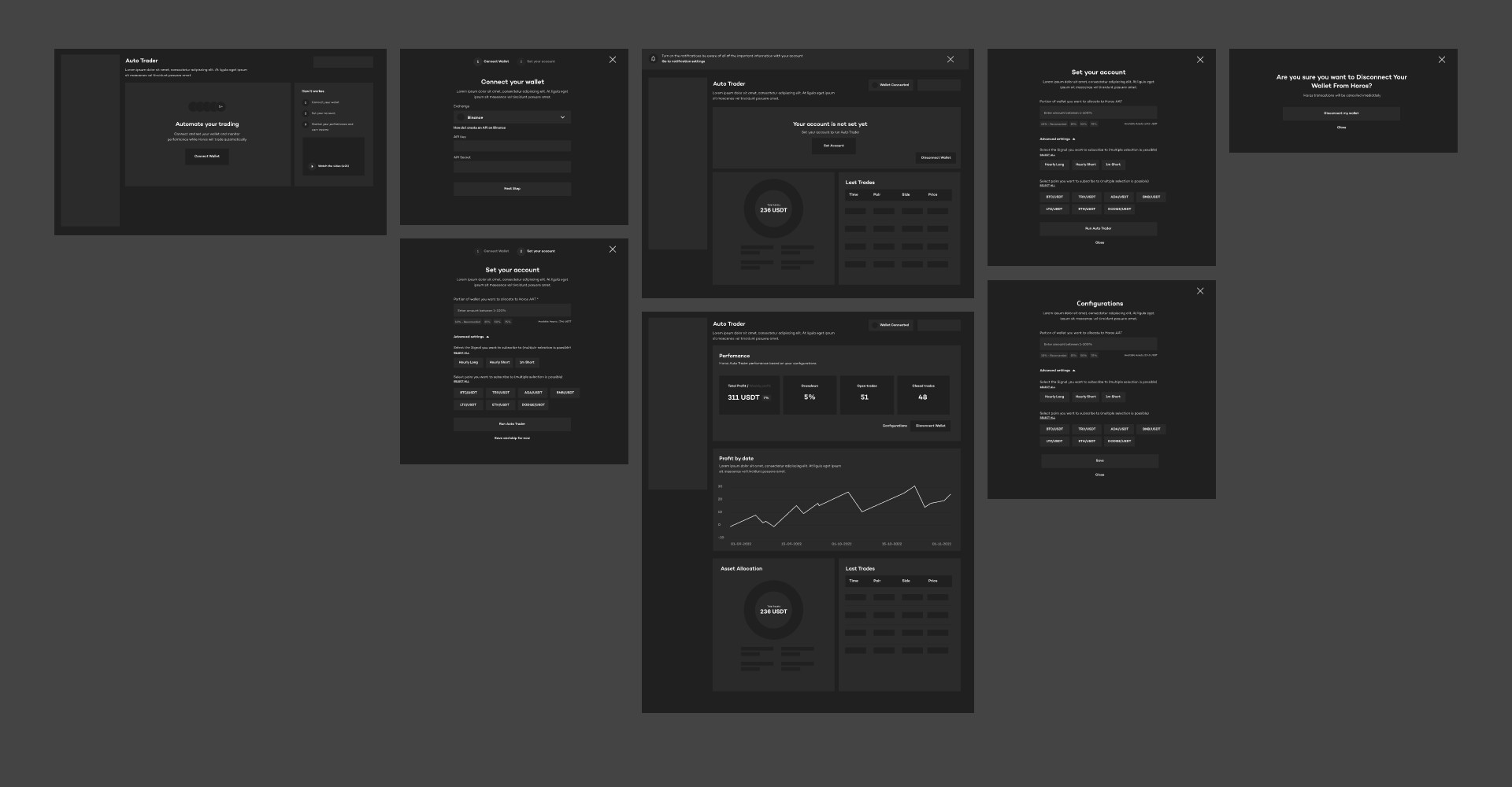 I mapped the full IA in about a week: sign-up, onboarding, wallet connection, dashboard, every trading module, and all modal interactions for desktop and mobile. We tested the structure with the team, refined it, then moved to wireframes.