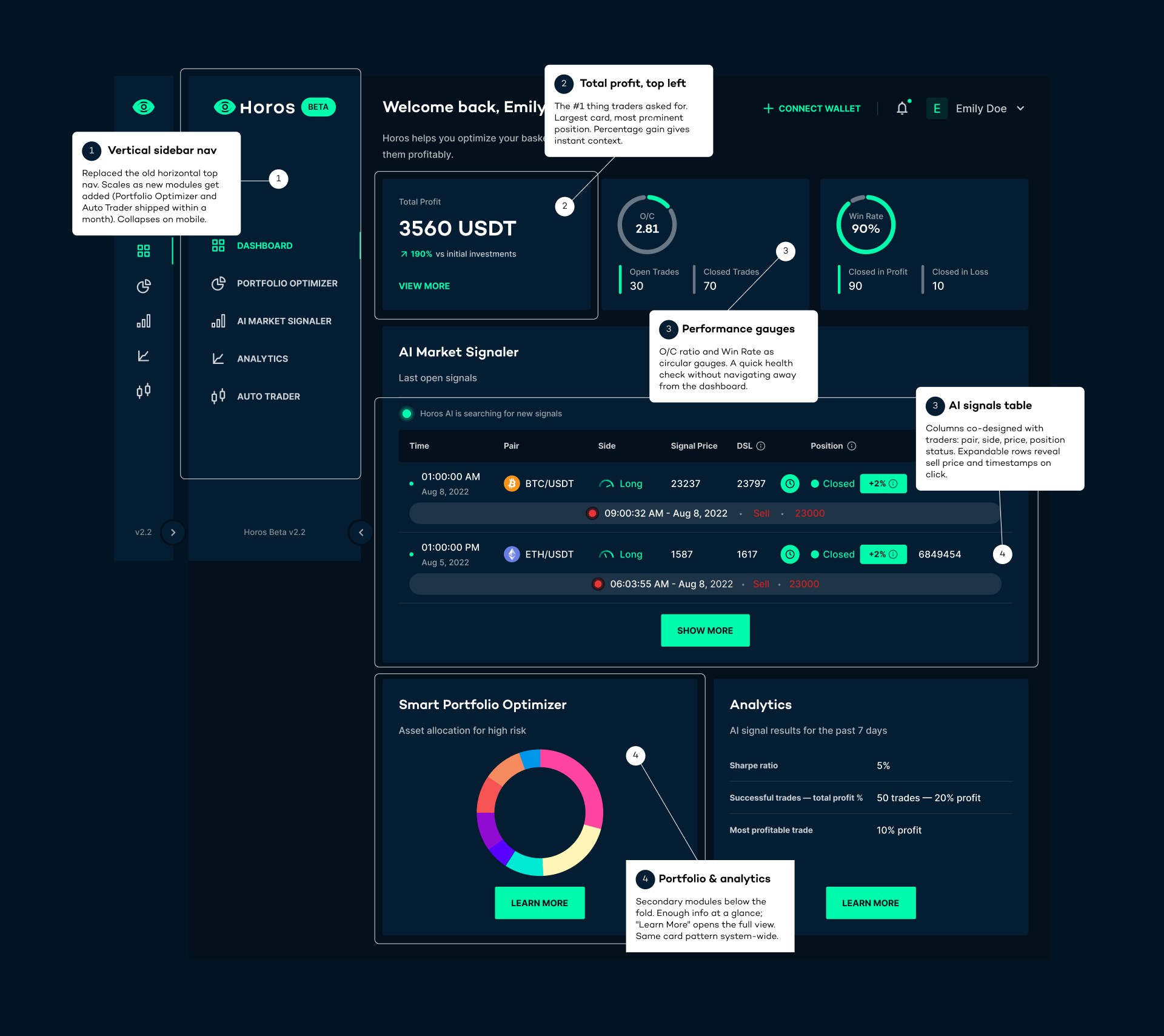 The MVP shipped on time and became the centerpiece of the investor pitch. More importantly, the user research I ran shifted the entire product direction: from portfolio optimization to AI-powered trading signals. That pivot reshaped the company's fundraising story and eventually led to a rebrand from Horos to Wisdomise as the product expanded beyond crypto.