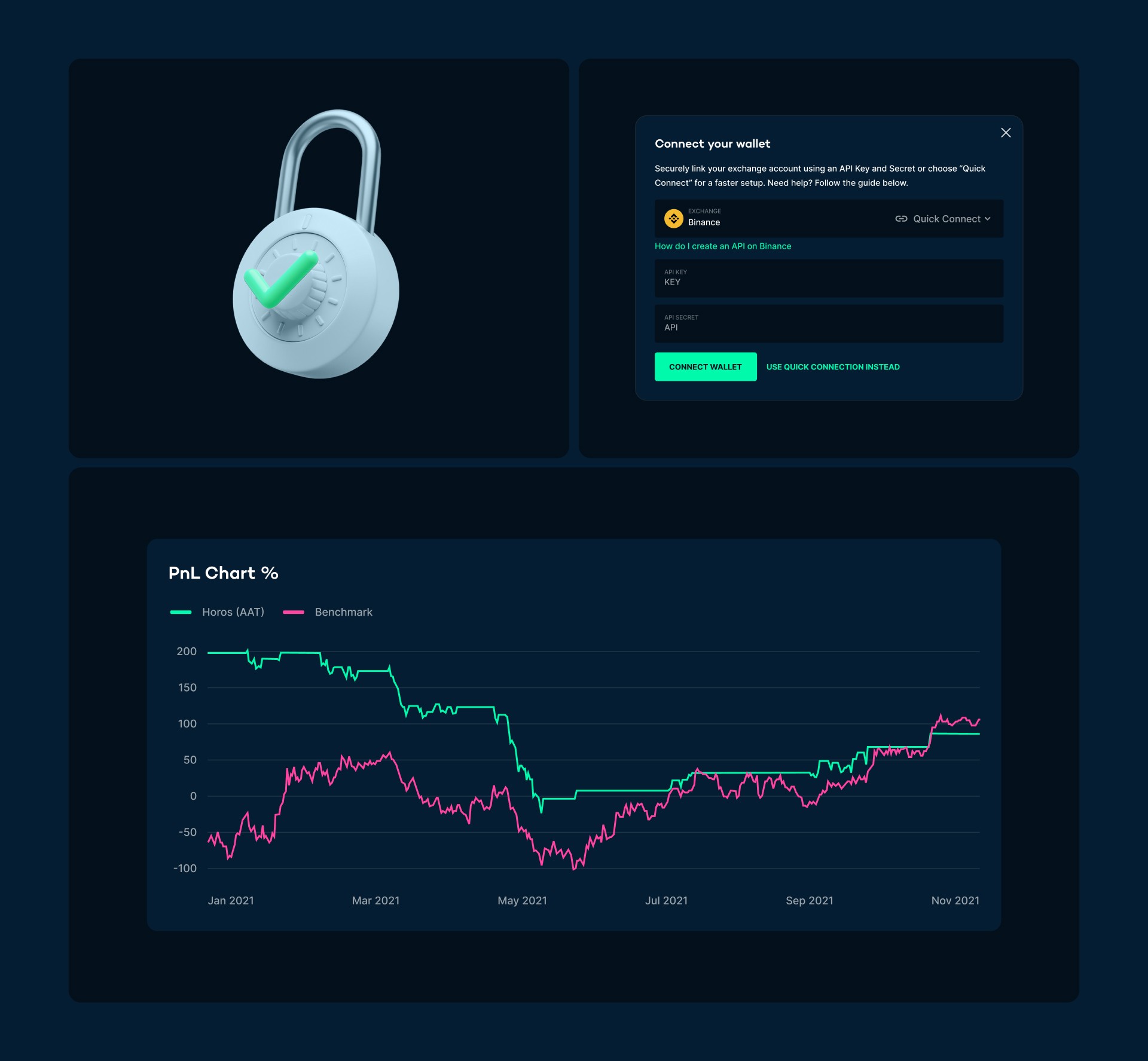 Onboarding and wallet connection flow: KYC verification, exchange linking via API or Quick Connect, and portfolio performance tracking from day one.