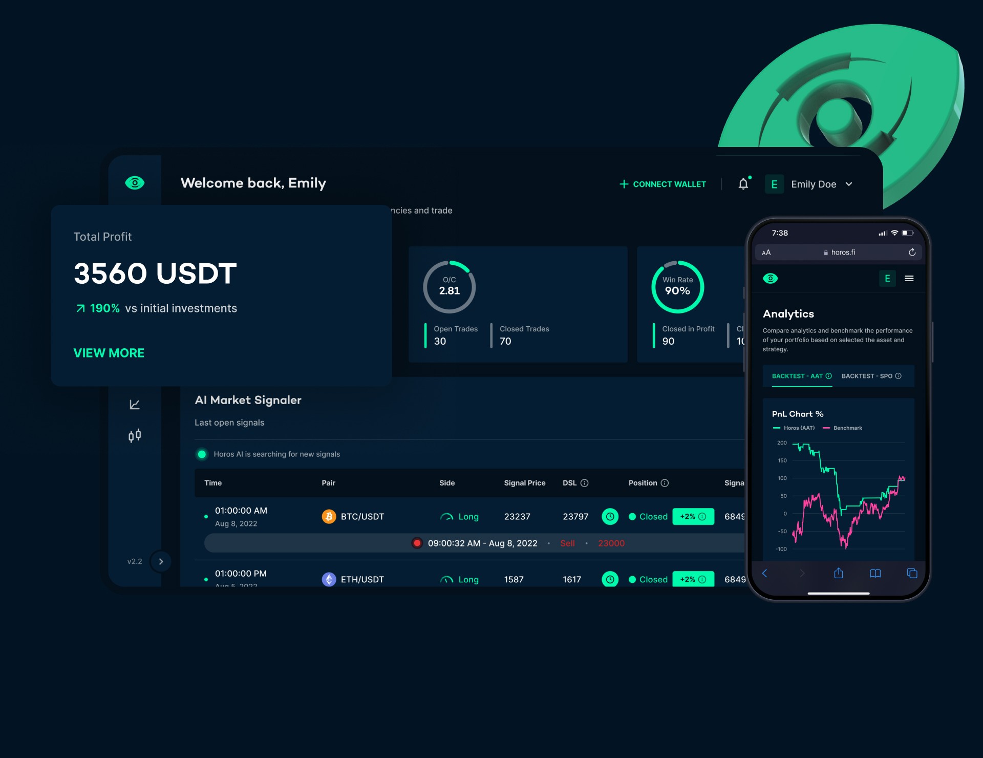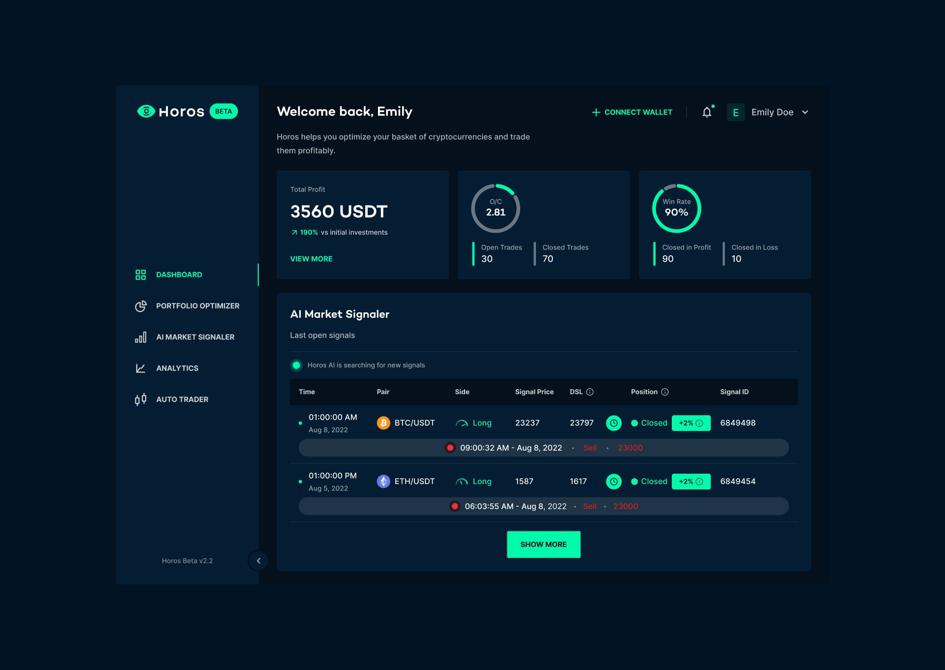 Total profit at top left, O/C ratio and win rate beside it for a quick performance check. Below, the AI Market Signaler shows live signals with pair, side, price, and position status. Portfolio allocation and analytics complete the picture. Each module shows just enough at a glance; click through to full tables when you need more.