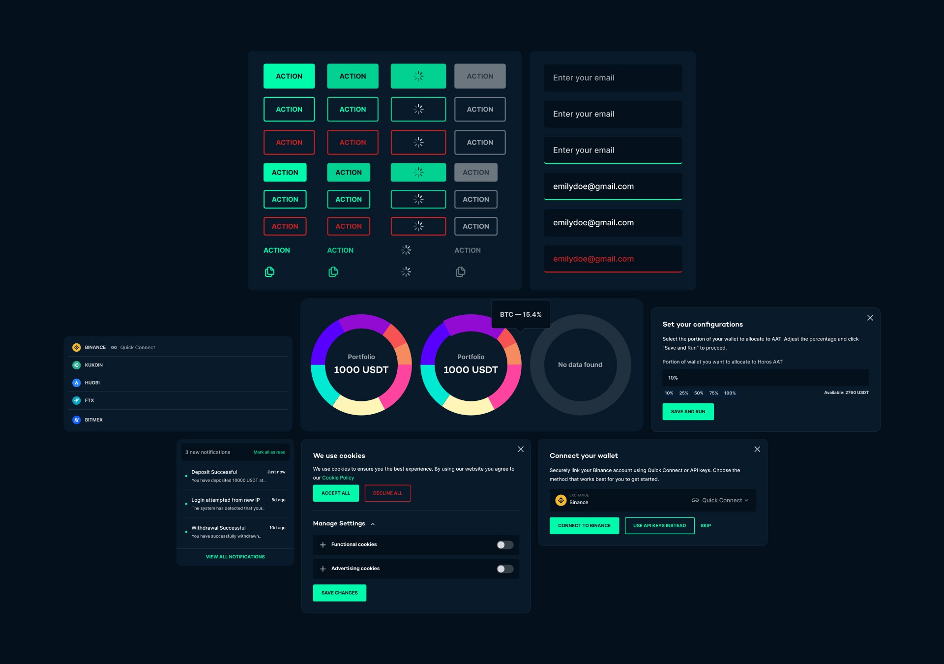 Platform flow: sign-up, onboarding, dashboard, trading modules, and modal interactions.