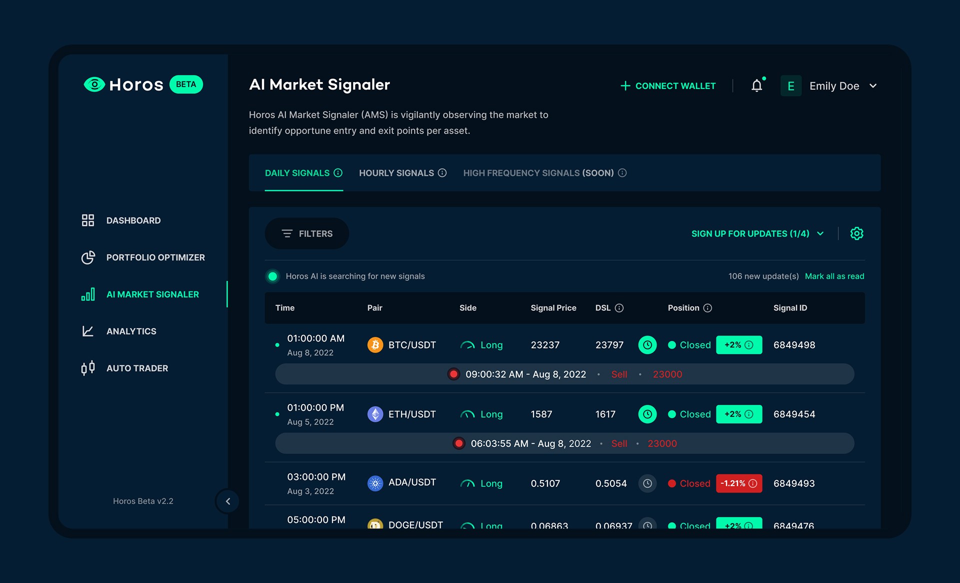AI Market Signaler: live trading signals with pair, side, price, and position status.