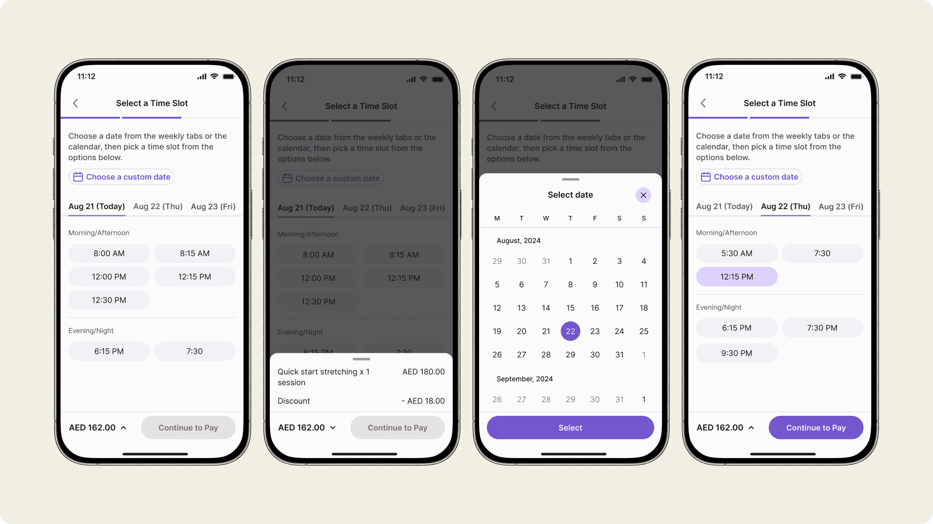 Old booking flow screens showing steps like selecting a coach, choosing a service, and completing the checkout.