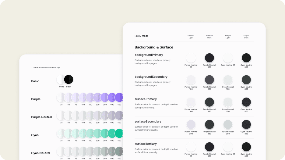 Standardized color tokens applied across brands, apps, and color modes, ensuring visual consistency throughout the system.