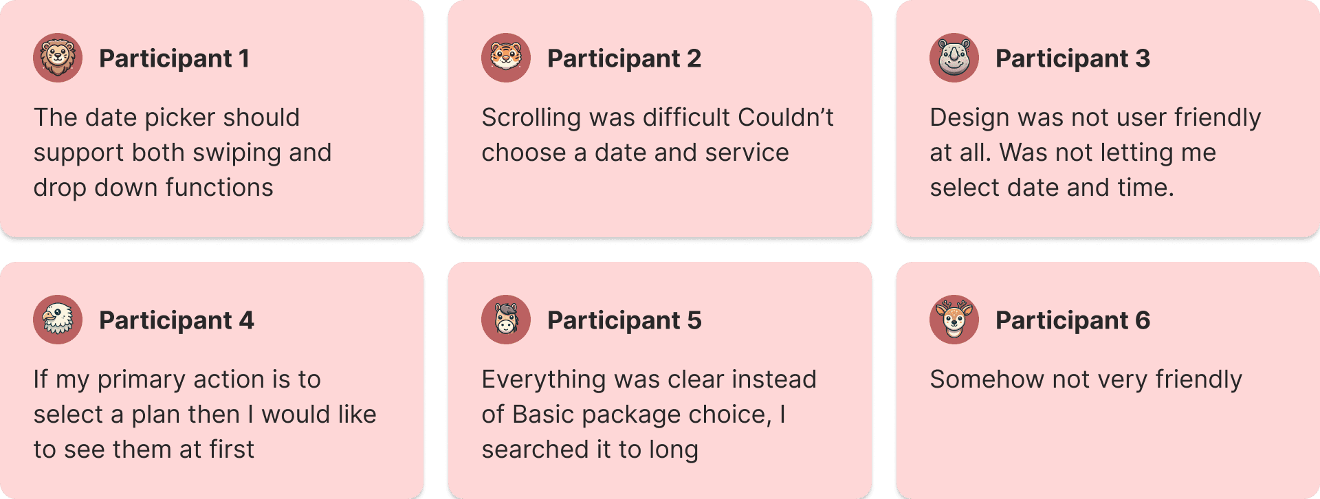 The snapshot of user feedback from the old booking flow usability testing.