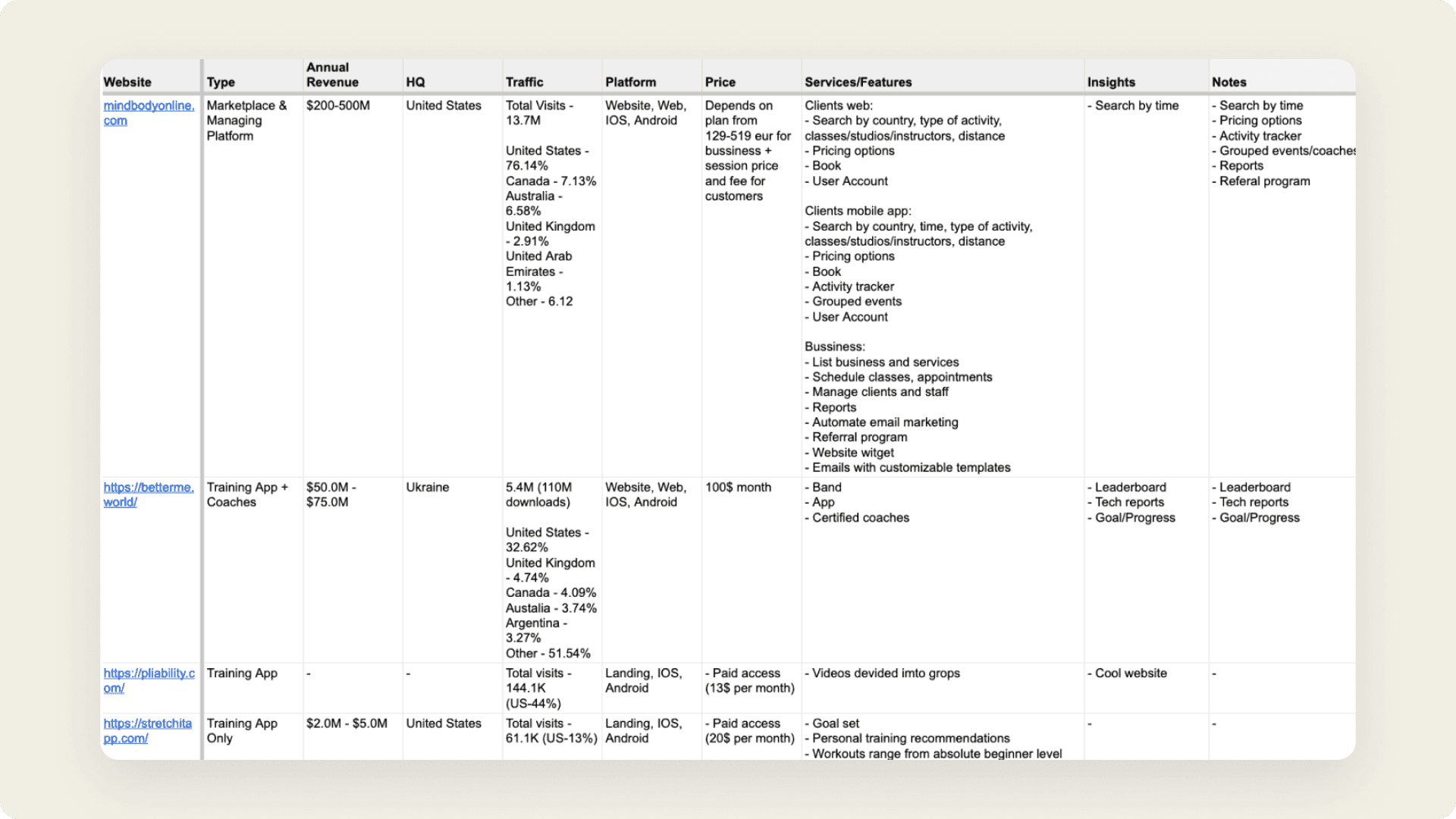 The spreadsheet compiled during this stage revealed crucial insights about the competition, including their revenue, client demographics, pricing models, and the features that attract new customers.
