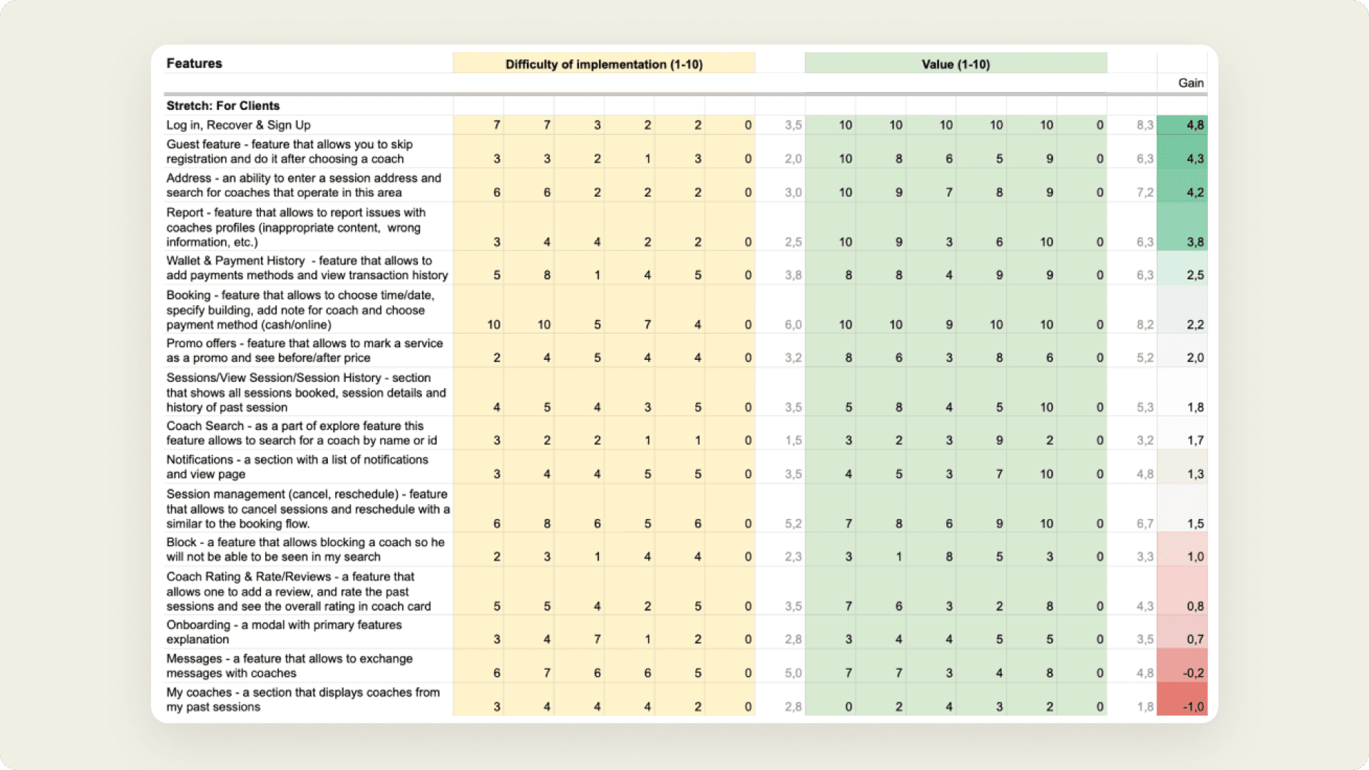 A section of the spreadsheet that prioritizes features using the Value vs. Effort Matrix framework.