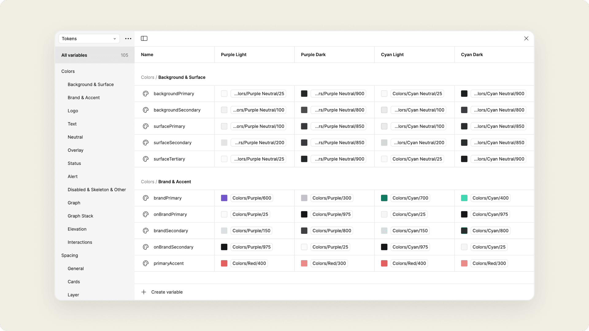 Screenshot of the Figma variables panel in the design system file.