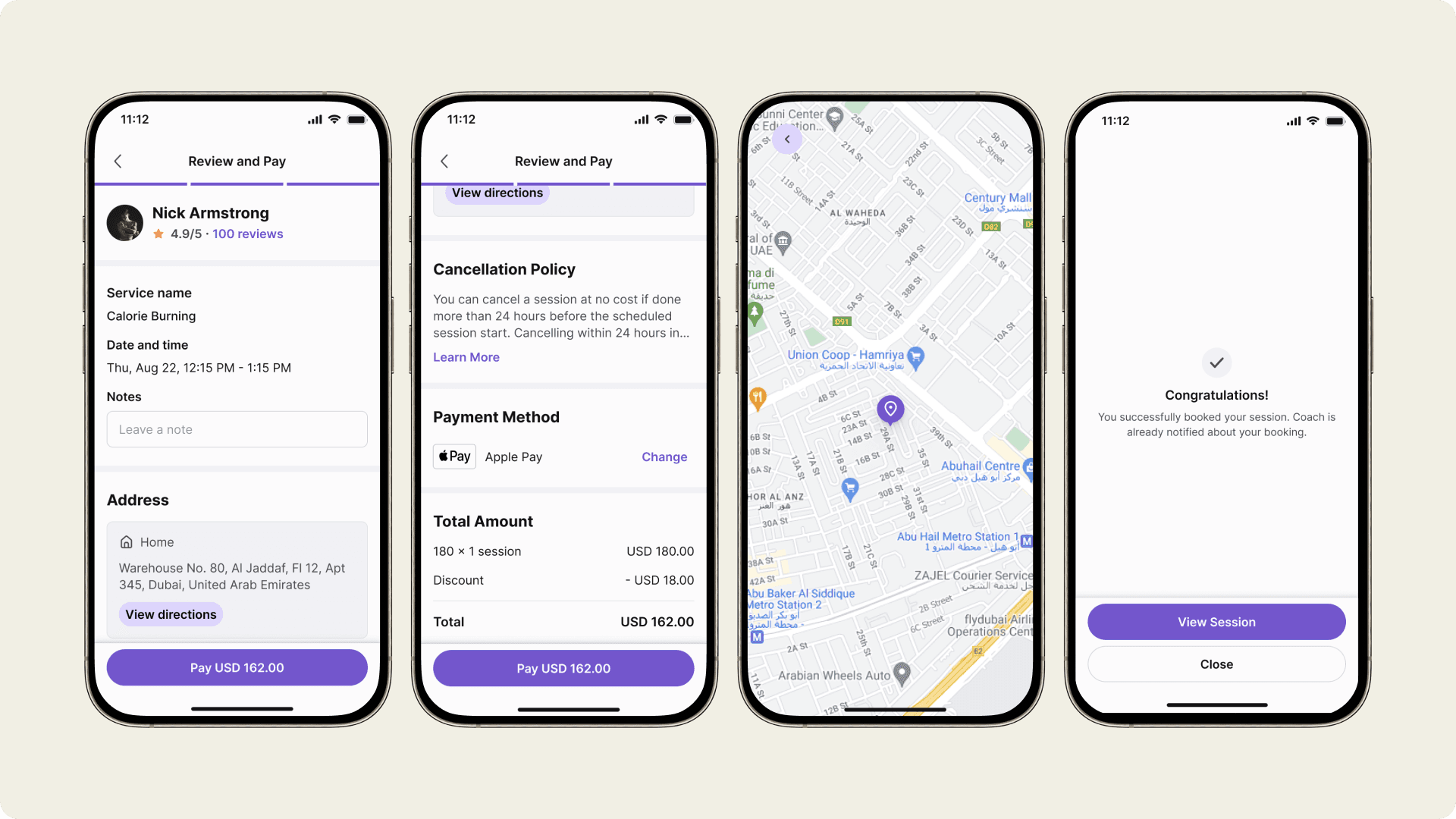 The booking process is streamlined to allow users to select a coach, pick a time and date, and complete the payment within a few taps.