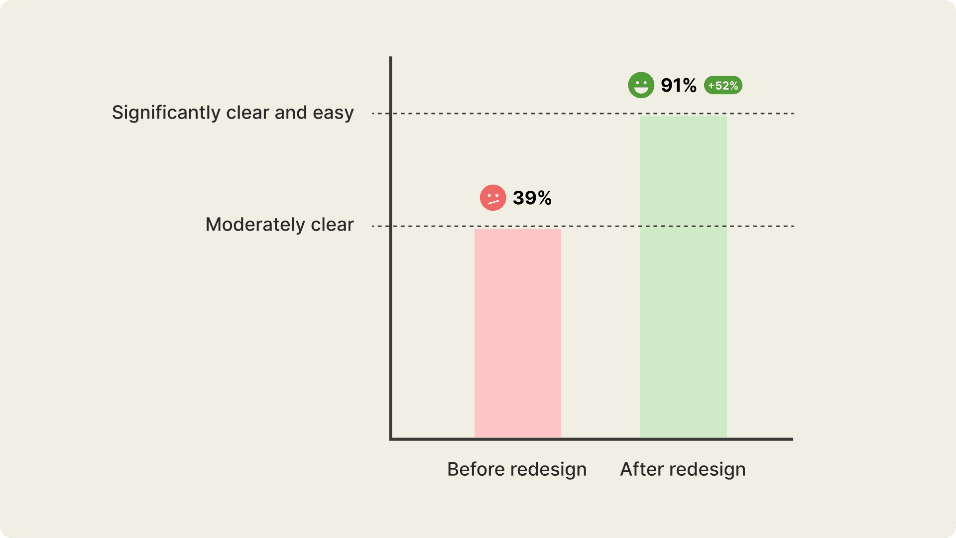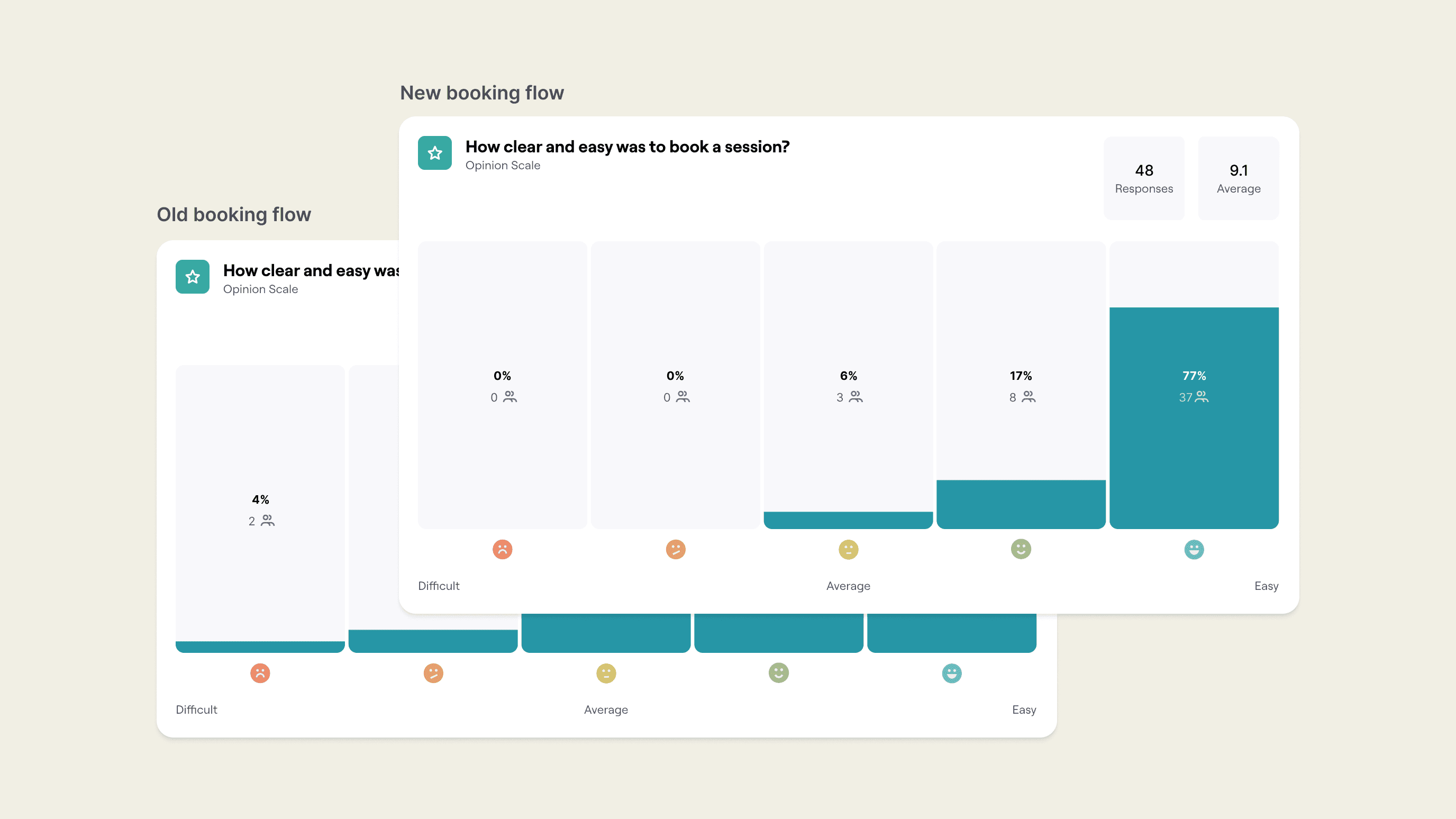 Users rate the new booking flow 52% better than the previous version. Before the redesign, most found the old flow unclear and difficult. After addressing user issues, nearly all find the new design clear and easy to use.