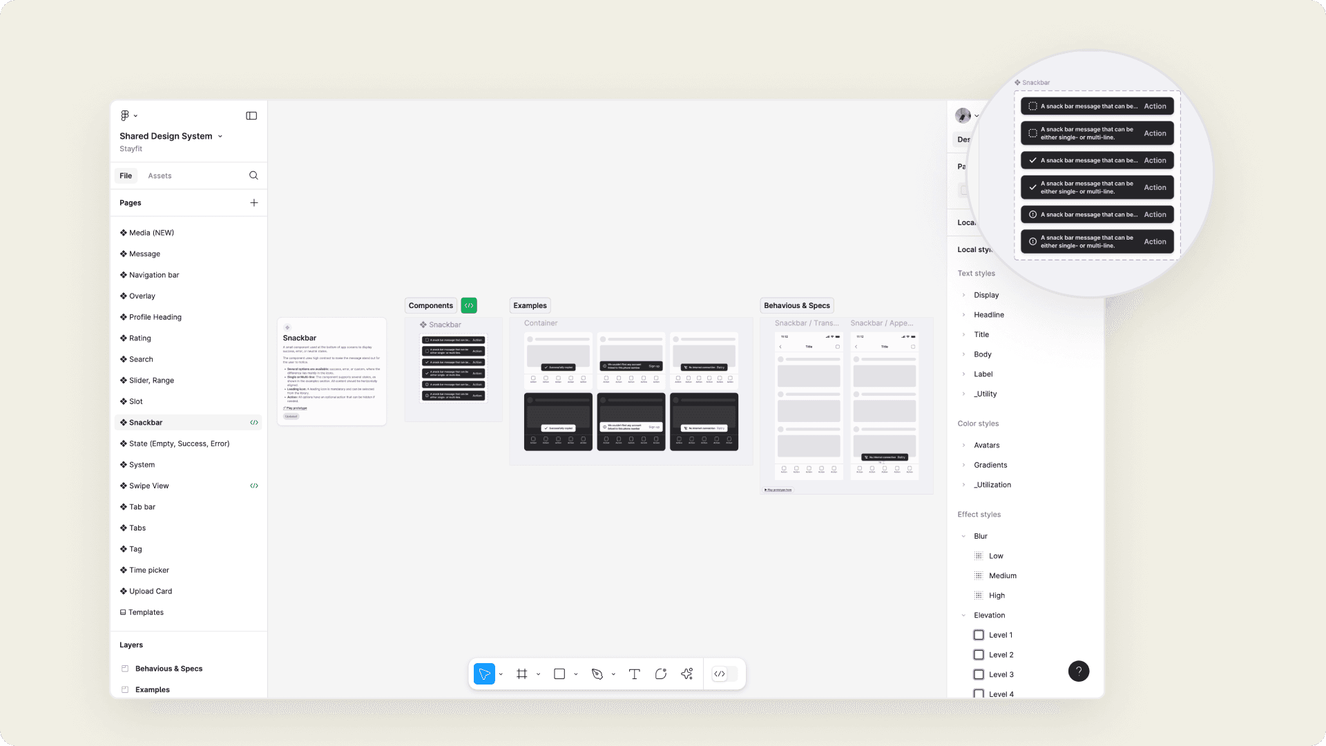 The design system includes variables for styles such as elevation, opacity, blur, radius, and spacing. These variables help maintain consistency and flexibility across the user interface.