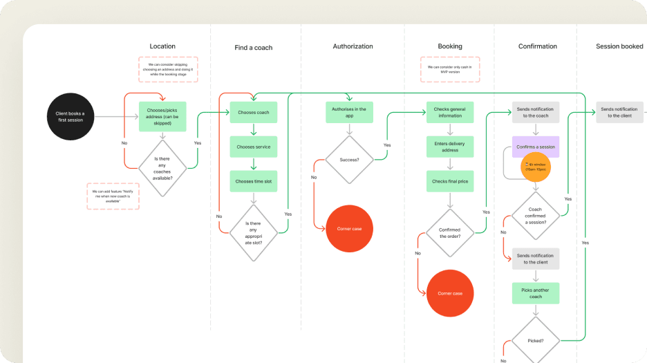 Robust wireframes were constructed using advanced tools such as Object-Oriented UX (OOUX) and Business Process Model and Notation (BPMN). This approach led to a refined app structure that effectively resolved all major issues identified in the initial phases.